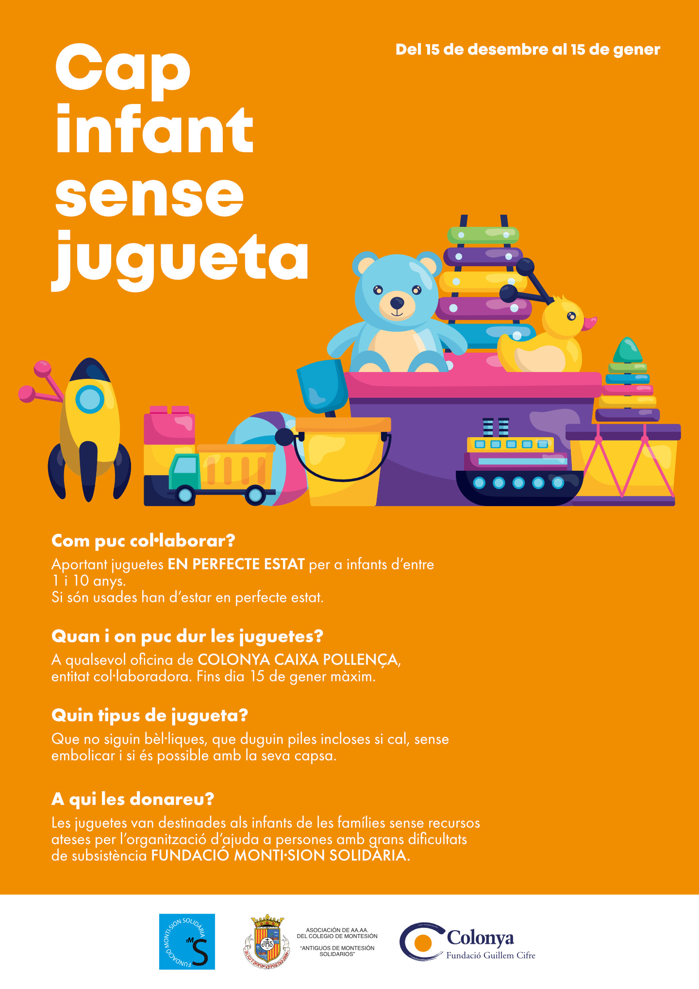 Por este motivo, Colonya ha organizado una recogida de juguetes que se realizará en las oficinas de Mallorca, con la colaboración de la Fundació Monti-sió Solidària.