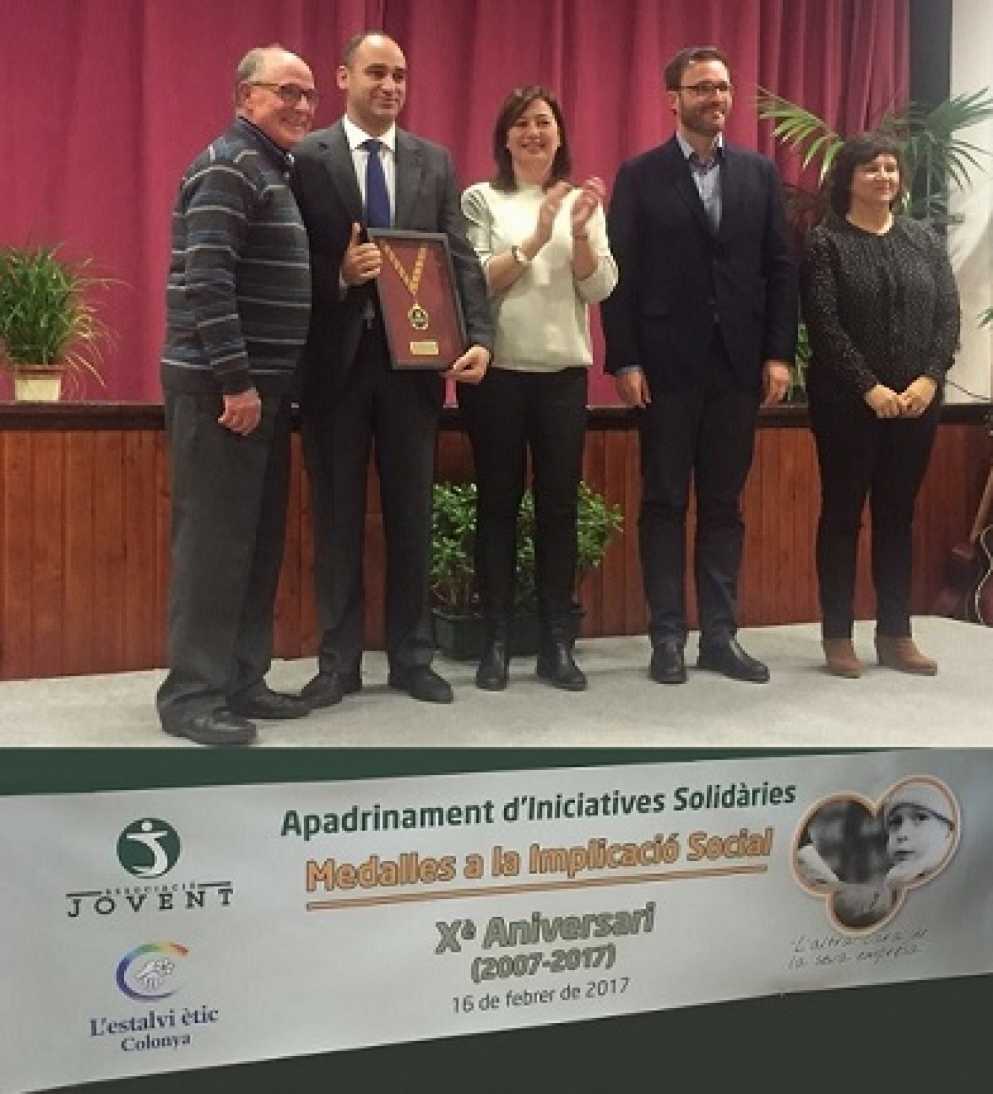 "Colonya, Caixa Pollença", recibe la “Medalla a la Implicació Social" en el X Aniversario del “Programa d'Apadrinament d'Iniciatives Solidàries”, celebrado día 16 de febrero, en el cual el Presidente de la “Associació Jovent”, Bartomeu Suave, acompañado de la Presidenta del Gobierno de los Islas Baleares, Francina Armengol, el Alcalde de Palma, José Hila, y la Presidenta del IMAS, Margalida Puigserver, han querido hacer un reconocimiento a las empresas, entidades financieras y fundaciones que durante esta década han apoyado a la “Associació Jovent”.